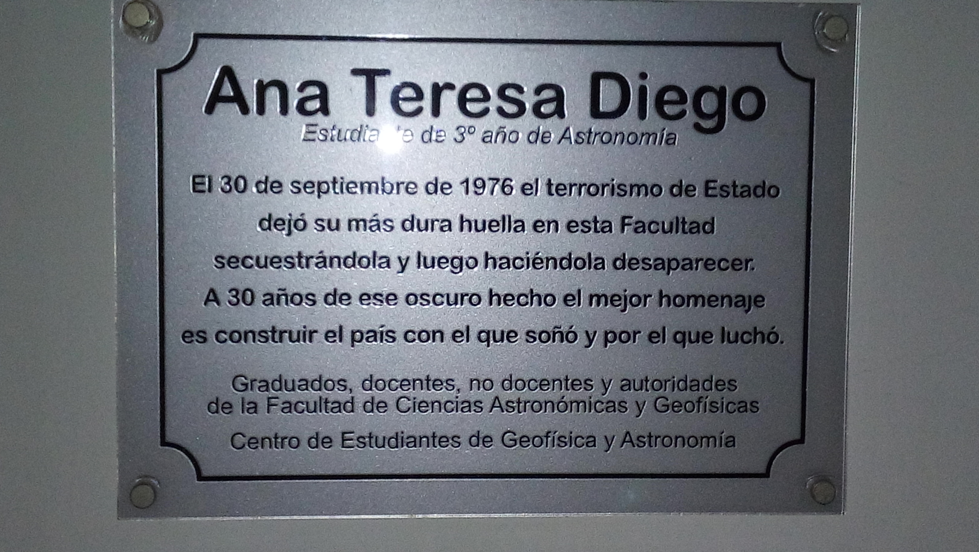 Semblanza de AnaAna Diego nació el 5 de noviembre de 1954 en Bahía Blanca. Hija de Zaida Franz que a la postre fuera fundadora de madres de plaza de mayo y del matemático Antonio Diego. Su compromiso social y sus ideales la llevaron a estudiar Astronomía en La Plata aún cuando había ganado una beca para hacerlo en Europa. Tenía 21 años al momento de su desaparición, al salir de su clase del tercer año del doctorado en astronomía en la Escuela Superior de Astronomía y Geofísica de la Universidad Nacional de La Plata. Ana era una chica dulce, con una increíble voluntad y fortaleza de cambio. Sus ideales, sus convicciones, su lucha por todo lo que involucraba lo social en busca de justicia social, igualdad de condiciones y libertad de pensamiento, No tenía violencia, ella pensaba que con la palabra y el ejemplo el país cambiaría. |